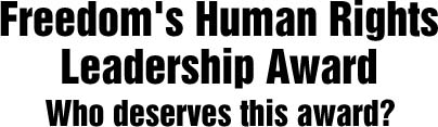 ominations are invited for Freedom Magazines Human Rights Leadership Award. Those who have received this award have distinguished themselves through exemplary contributions to human rights. Their good works to advance the cause of Freedom serve as a model of inspiration to others.