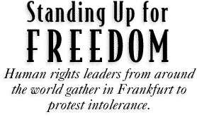 Prominent American human rights advocate Ted Eagans told the audience he was traveling from Germany directly to human rights hearings at United Nations headquarters in Geneva. He said he had long been aware of the problem with discrimination in Germany, but after meeting with people from different religious and ethnic groups and gaining first-hand evidence of prejudice, he would ensure this was also known about in Geneva so it could be acted upon. A report compiled by Eagans, with the help of Professor Bilamiuk and other human rights and religious leaders who attended the Frankfurt march, was subsequently delivered to the United Nations High Commissioner for Human Rights and the staff of the Special Rapporteur on Religious Intolerance.