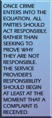 Once crime enters into the equation, all parties should act responsibly, rather than seeking to prove why they are not responsible. The service providers responsibility should begin at least at the moment that a complaint is received.