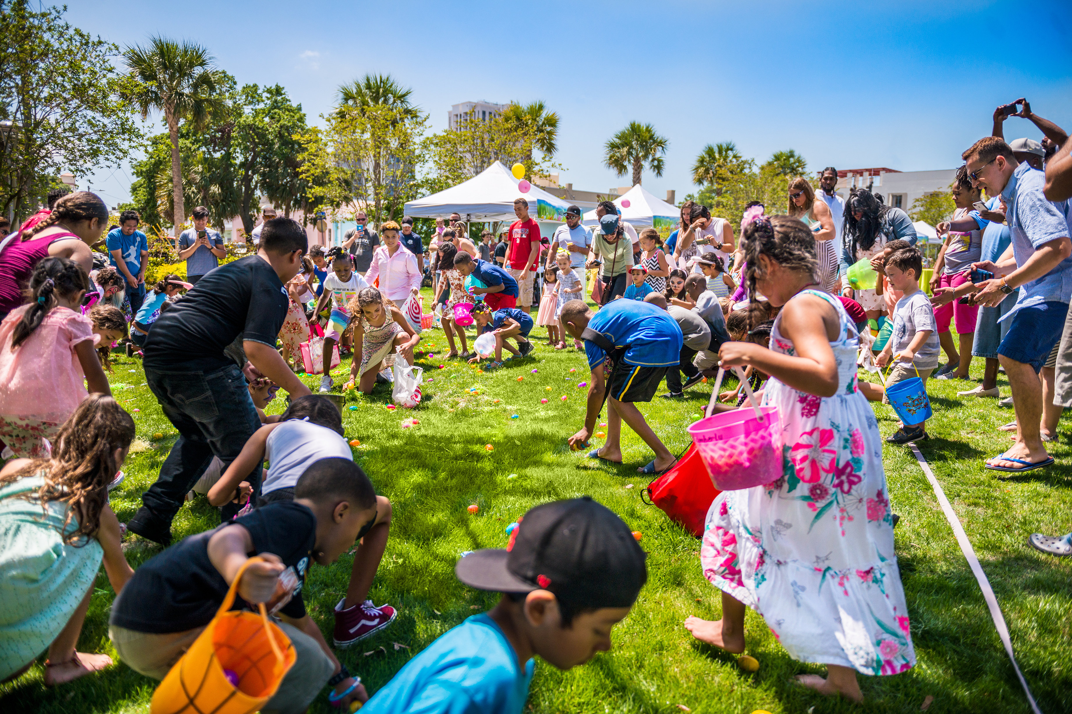 Running around is the name of the game, without a doubt. When the 2018 Giant Easter Egg Hunt began, the central lawn at Coachman Park, near the Clearwater Marina, was thickly blanketed by thousands of brightly colored Easter eggs and bordered by almost 8,500 eager treasure hunters in spring colors. The vibrating, fidgeting youngsters, released by the GO! signal at 12:30 p.m. sharp, swarmed onto the field, zigzagging and snatching eggs as they ran. Within a few minutes the kids had harvested about 30,000 goodie-stuffed plastic eggs and the lawn was green again, as if a large vacuum cleaner had swept it clean.